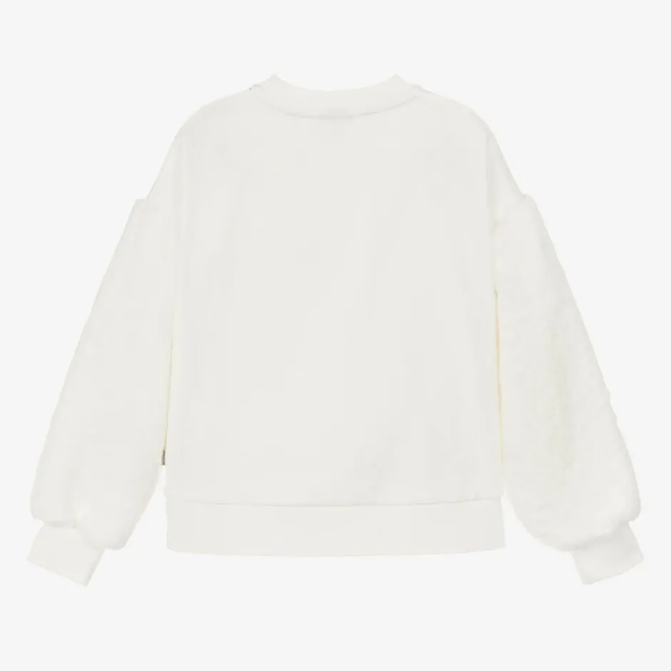 Super cool ivory cotton sweatshirt for girls by German brand BOSS, with a large, embossed silver Double B logo on the front. Made in soft, comfortable jersey, it has dropped shoulders with fun, faux fur, long sleeves and cosy, ribbed trims.