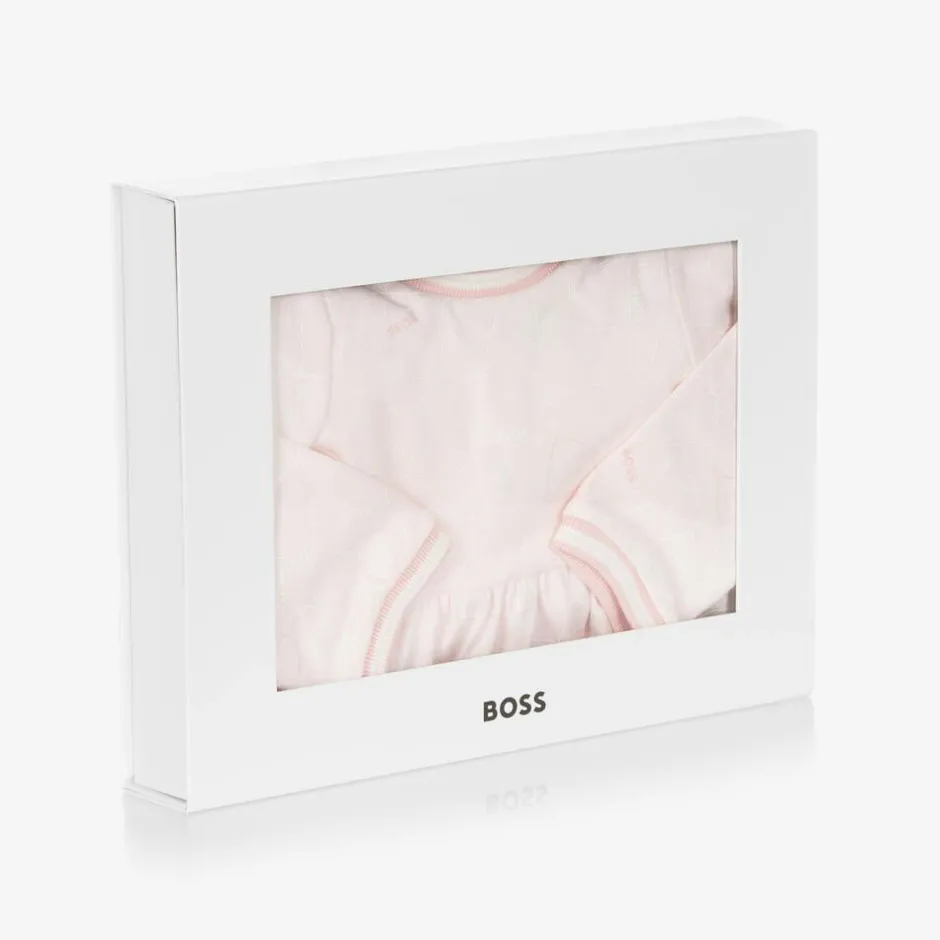Cute and comfortable, a pale pink organic cotton dress for little girls by German designer BOSS, with a contrasting pink and white pattern of ginkgo leaves and logos. It has ribbed trims striped in shades of pink and a full, gathered skirt. There are branded popper fastenings on the back to assist with dressing.