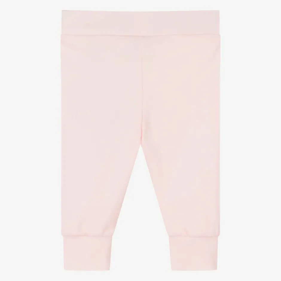 Pale pink full-length leggings for younger girls by BOSS, made from soft and stretchy organic cotton jersey. Casual and comfortable, they have a gently elasticated waistband and lightly ribbed ankle cuffs, one of which features a tonal logo print for a subtle designer touch.