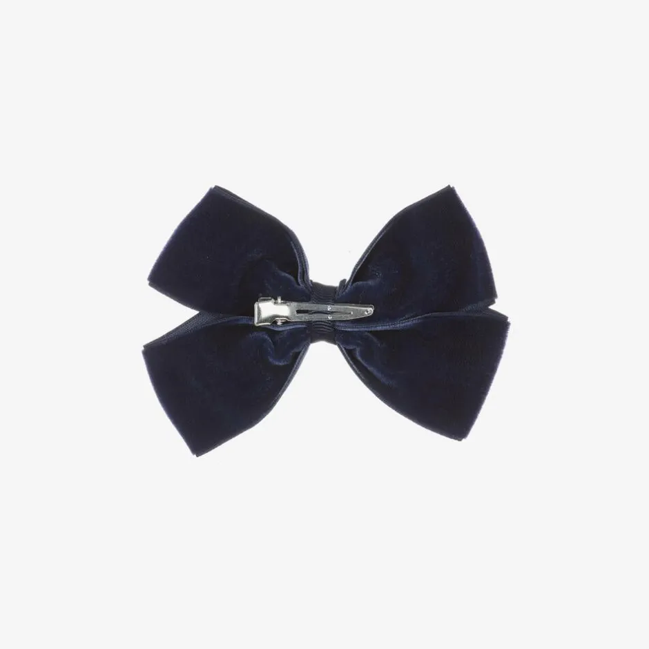 A navy blue velvet hair clip for girls by Bowtique London. Gorgeous for accessorising, this handmade bow is set on a metal clip.