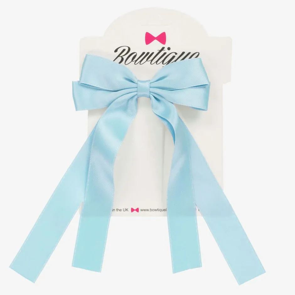 A beautiful, sky blue double bow hair clip for girls by Bowtique London, handmade in satin ribbon. The bow has elegant long tails and is set on an easy-to-use metal clip.