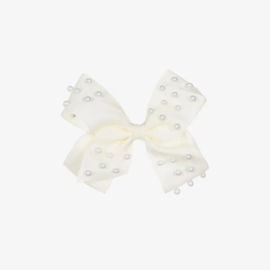 A pretty ivory grosgrain bow hairclip for girls by Bowtique London, decorated with scattered faux pearls. It is attached to a metal crocodile clip.