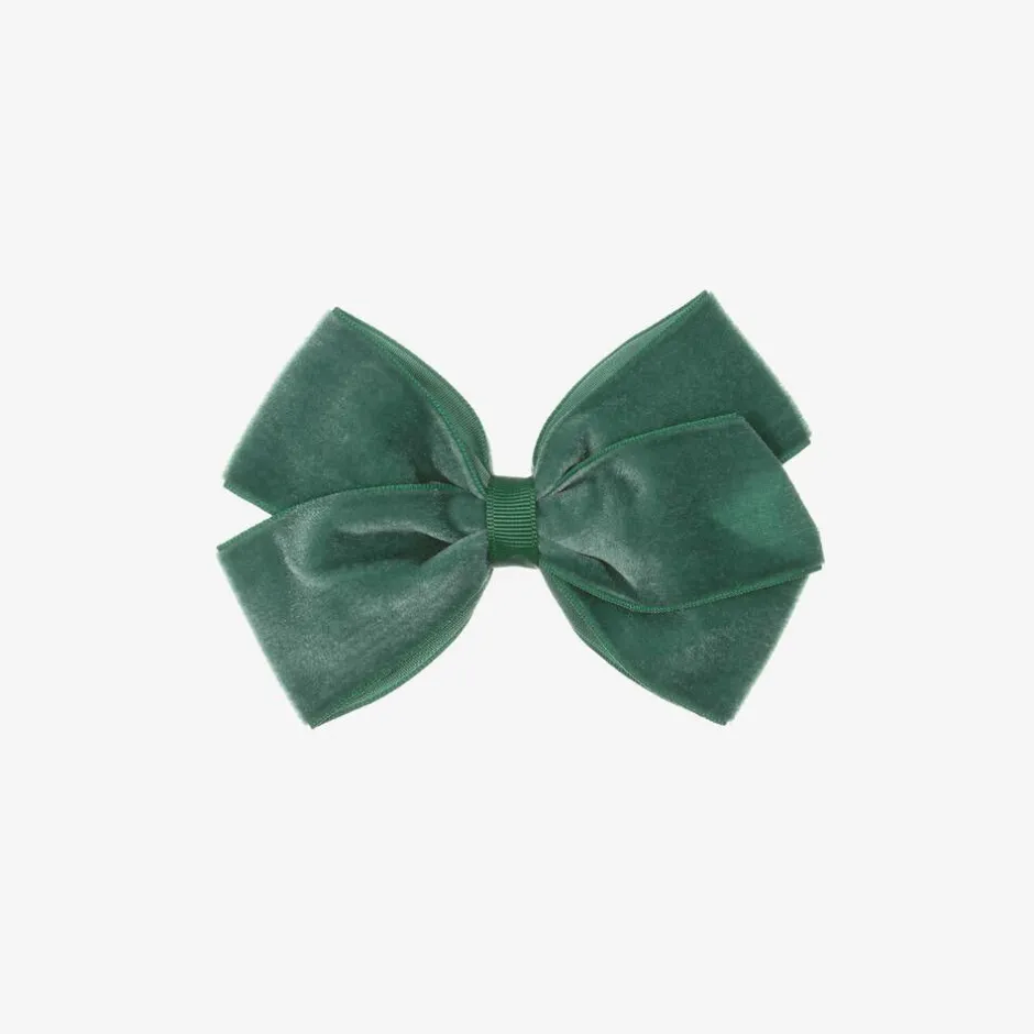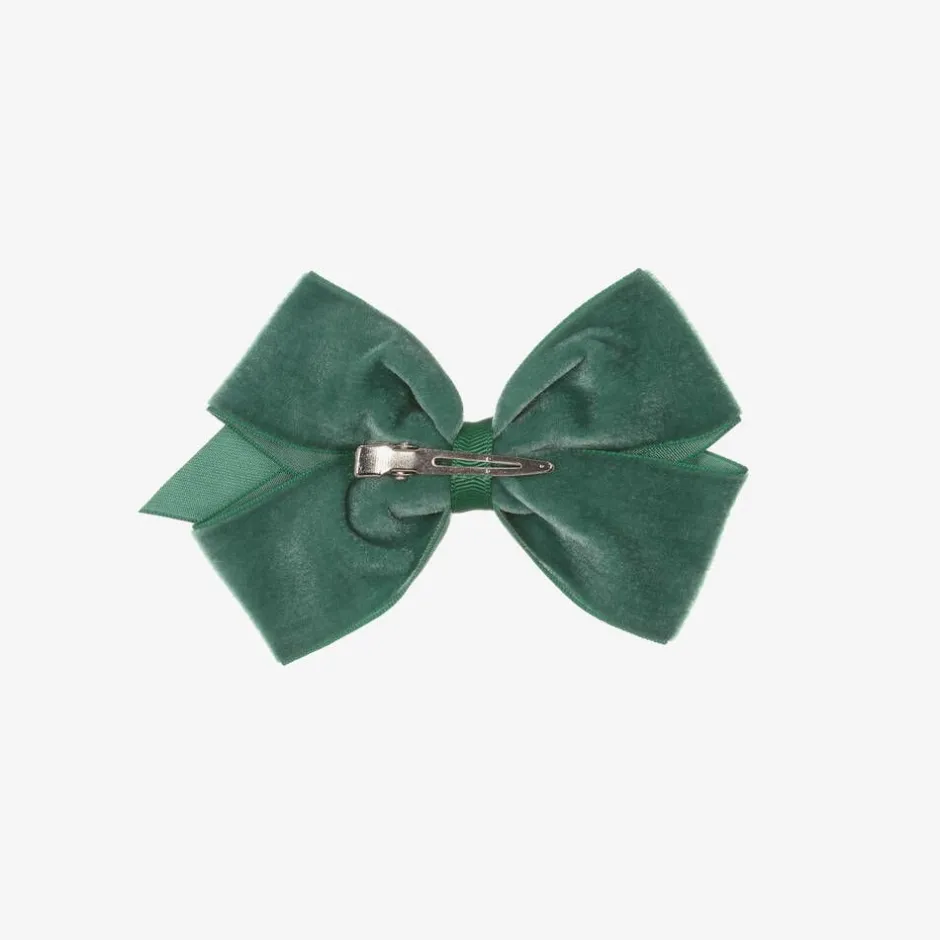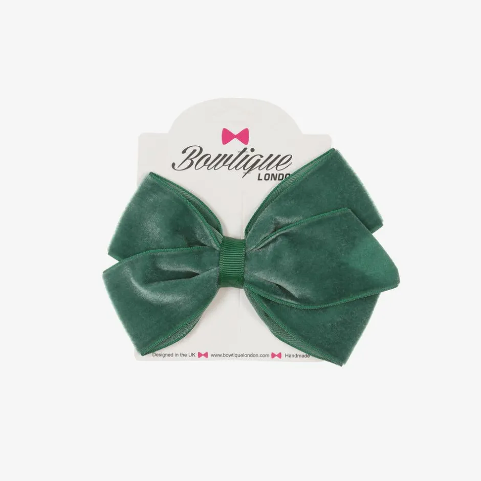 A dark green velvet hair clip for girls by Bowtique London. Gorgeous for accessorising, this handmade bow is set on a metal clip.