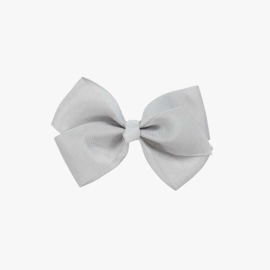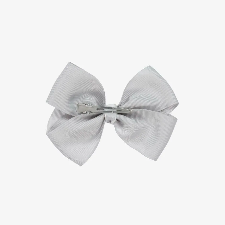 A pale silver grey hair clip for girls by Bowtique London, lovely to accessorise an outfit. The bow is handmade in delicate grosgrain ribbon and set on a slide-in metal clip.