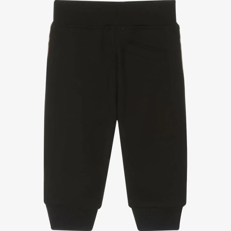 Casual black jersey joggers for baby boys by luxury British fashion house Burberry. For a distinctive look, they are trimmed with the brand's Vintage check pattern on the sides in beige, black and red. They have an comfortable elasticated waist, ribbed ankle cuffs, and a useful slip pocket on the back. This product contains organic cotton.