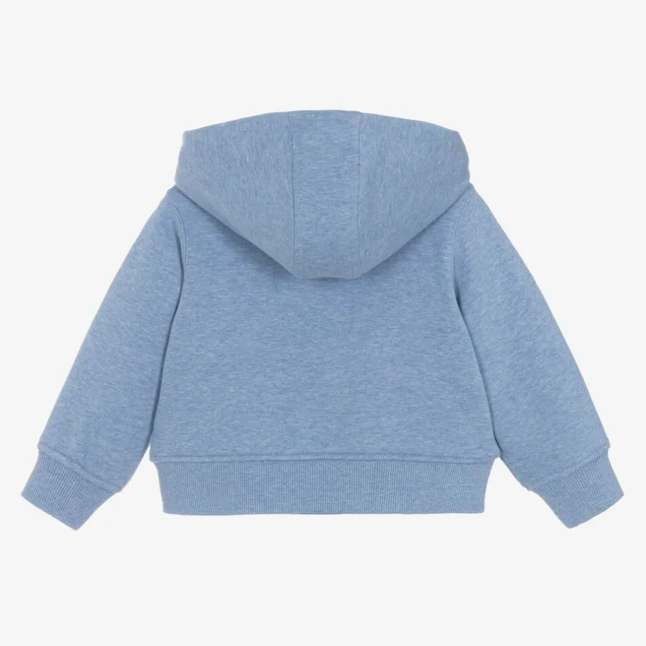 Baby boys zip-up hoodie by luxury brand Burberry, in a light blue marl. Made in comfortable cotton jersey, this long-sleeved top has an Equestrian Knight Design embroidered on the front in white to mark the British designer's heritage. Delicate logo lettering can also be seen below. It has a silver zip front, a lined hood and ribbed detailing on the cuffs and hem for warm layering.