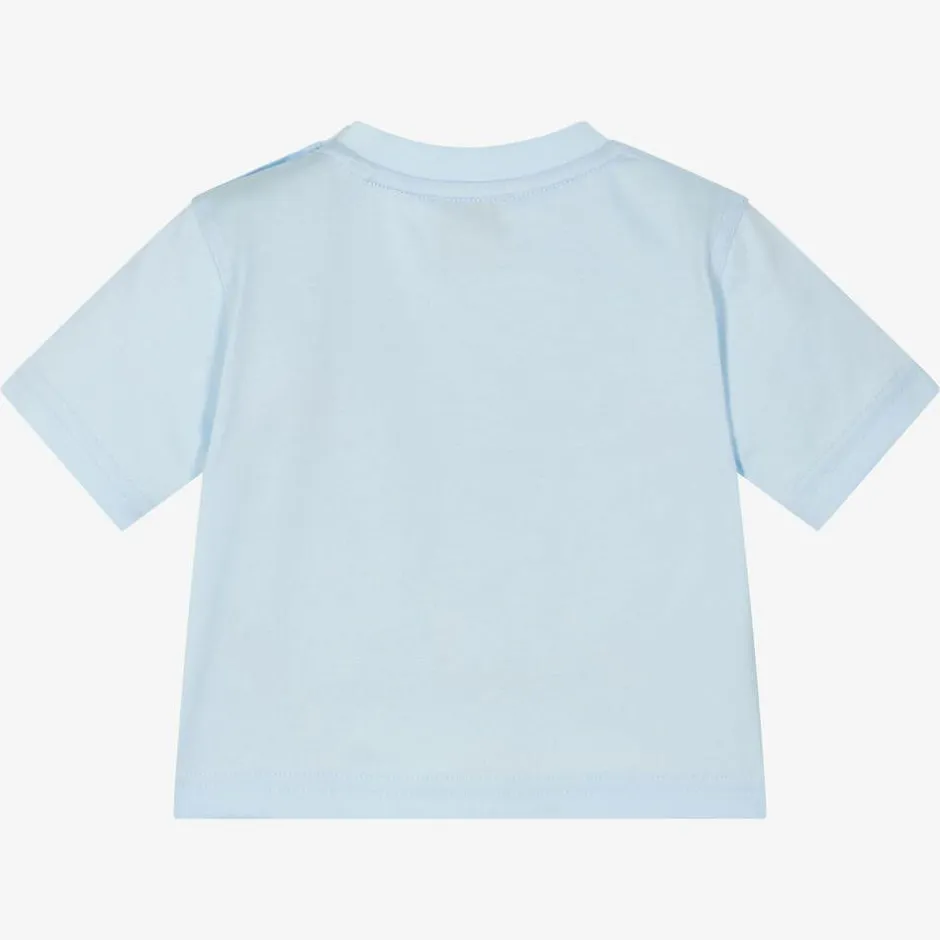 Stylish pale blue T-shirt for baby boys by luxury brand Burberry, made in soft cotton jersey. The designer's iconic Equestrian Knight Design print can be found on the front in beige, orange and red, with navy blue crest detailing. It fastens easily with shoulder buttons.