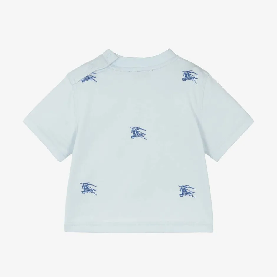 A pale blue short-sleeved T-shirt for baby boys by luxury brand Burberry, made from soft cotton jersey. It is embroidered with Knight blue Equestrian Knight Designs for an instantly recognisable look. Comfortable to wear, it has popper fastenings on one shoulder to help with dressing. This product contains organic cotton.