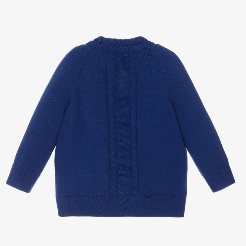A Knight blue long-sleeved cardigan for baby boys is by luxury British brand Burberry. Made from a soft and cosy wool knit, it has cable knit detailing around the V-neckline, on the front buttoned placket, and on the back for added style. There is a white embroidered Equestrian Knight Design patch stitched on one side for a signature finish.