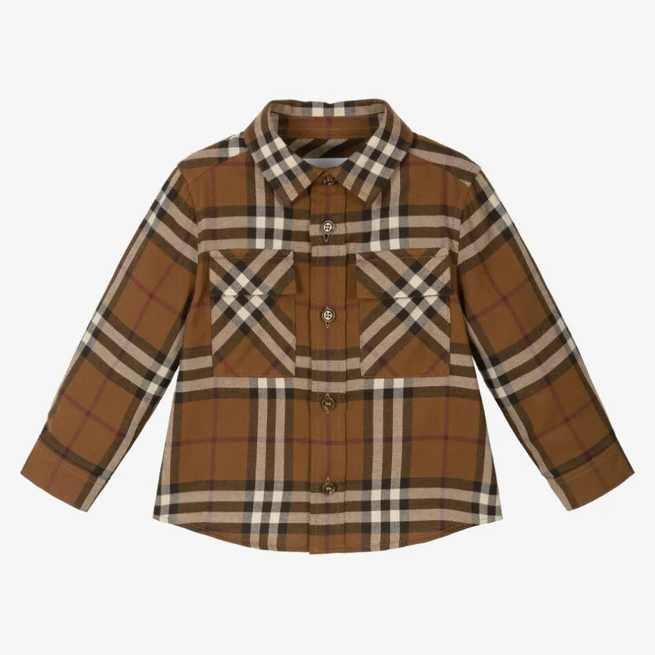 In the designer's shade of dark birch brown, this classic fit shirt for baby boys is by luxury British brand Burberry. It is patterned in the house's Vintage check and has two chest pockets. Made softly brushed cotton twill, it has button fastenings on the front and cuffs.