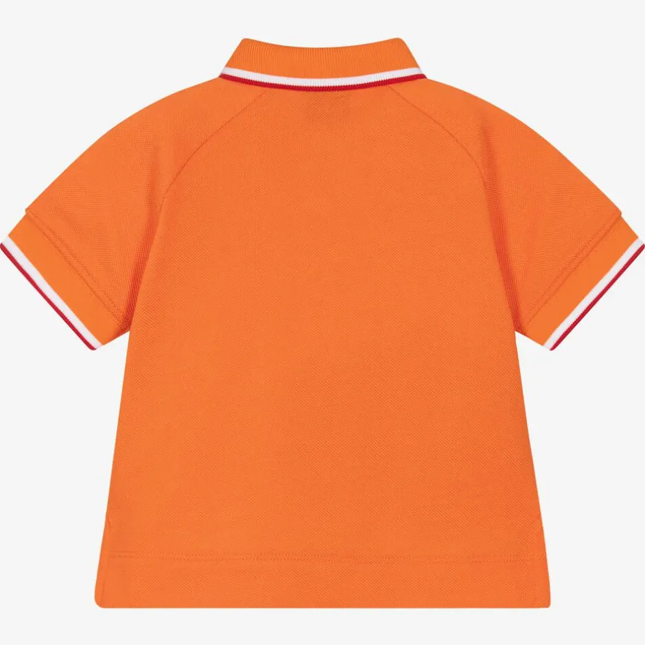 In a striking orange shade, this smart-casual polo shirt for baby boys is designed by luxury British designer Burberry. The front is printed with a white script logo on the chest, detailed with white and red piping for classic polo styling. This product contains organic cotton.