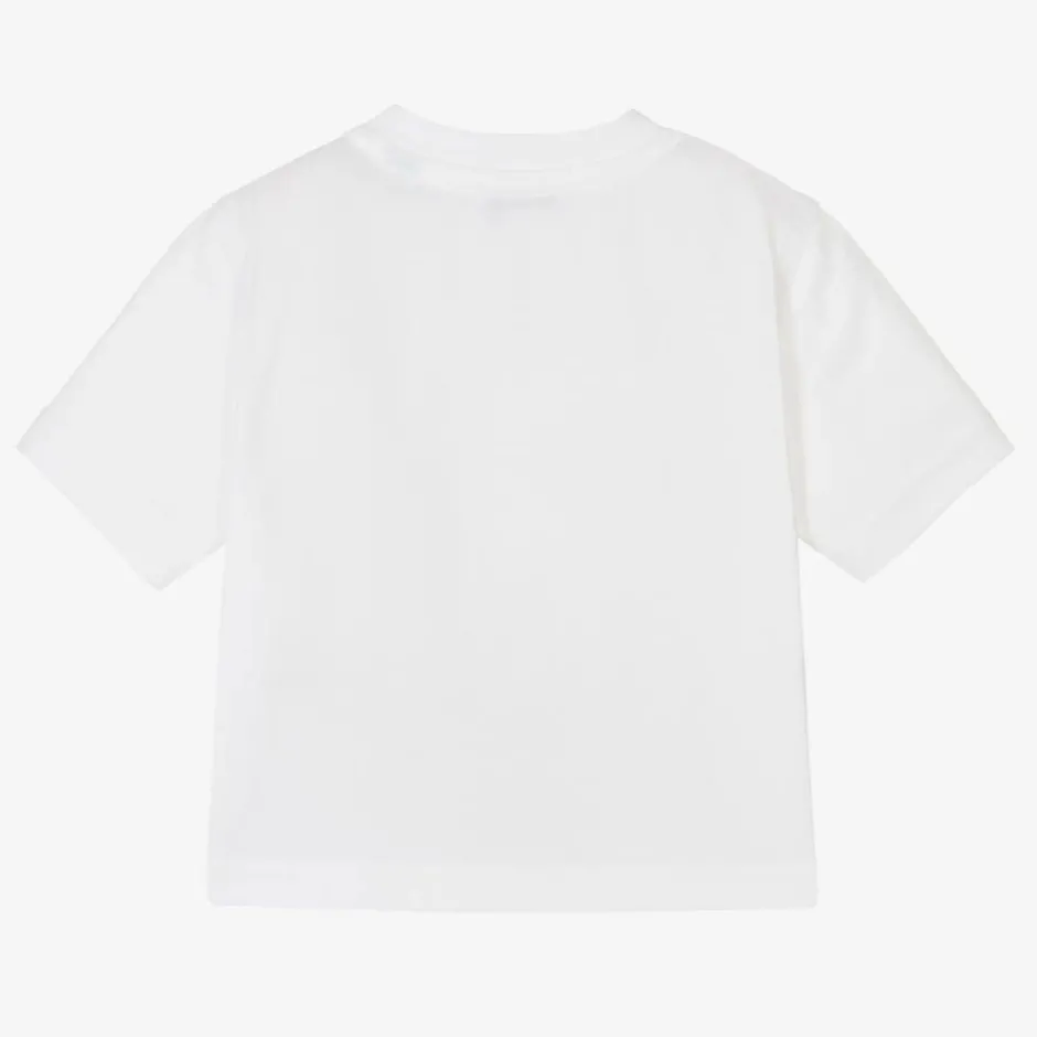 Baby boys classic white T-shirt by Burberry, made in soft organic cotton. The brand's stamp logo in black textured silicone adorns the front for a stylish designer statement. There are buttons on one shoulder to help with dressing.