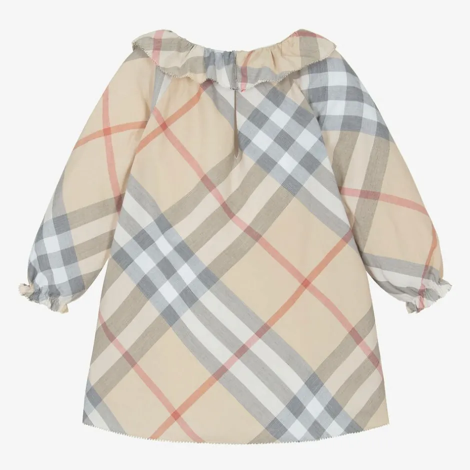 Beige cotton poplin dress for baby girls by British luxury brand Burberry, designed in the label's distinctive pale stone check. Fully lined in lightweight voile, this long-sleeved dress has a cute ruffle collar and delicate fringed trims. It fastens simply with a button on the back and pairs with matching elasticated knickers to complete the look.