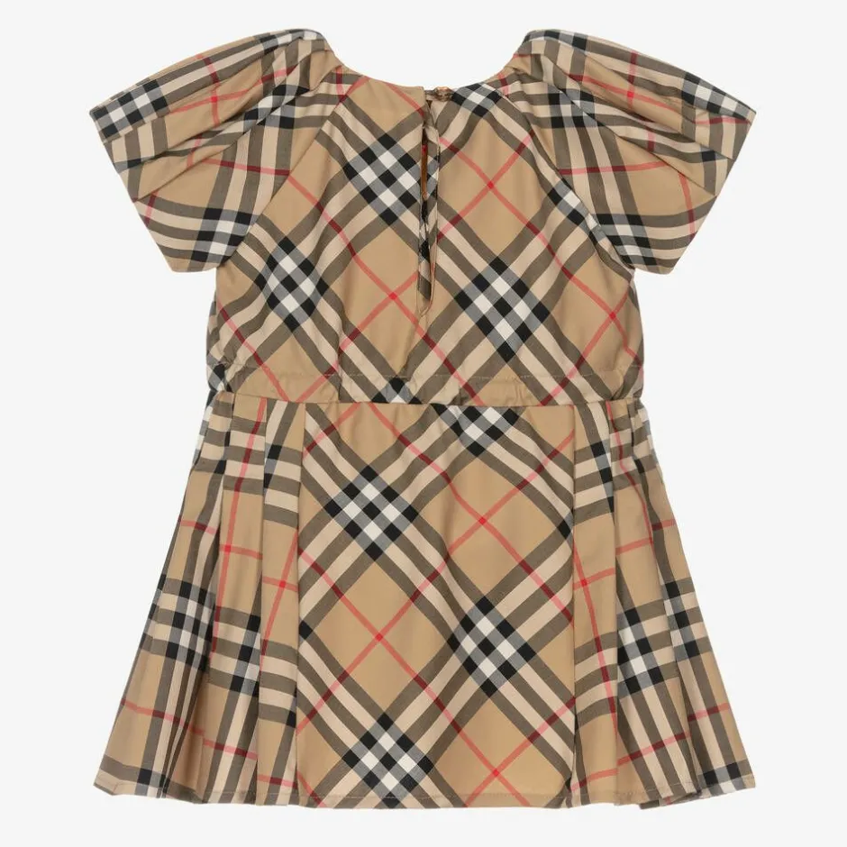 An Archive Beige dress for baby girls by British Heritage designer Burberry, signed with the famous Vintage Check pattern reimagined on the bias. Designed with comfort in mind, it is woven in luxuriously soft and lightweight cotton with slight stretch. The waist can be cinched in, using the matching check ribbons, and tied into a bow on the front. It fastens with a single mock tortoiseshell button on the back. A feminine silhouette, the skirt is pleated on the sides and the short sleeves are gathered to create a sweet puff effect.