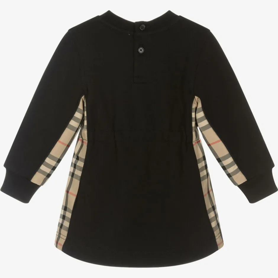 Cool black dress for baby girls from luxury British brand Burberry, made in mid-weight cotton jersey. Instantly recognisable, it has beige Vintage check trims on the sides. It fastens with buttons on the back and has an elasticated drawstring waist for a pretty shape.