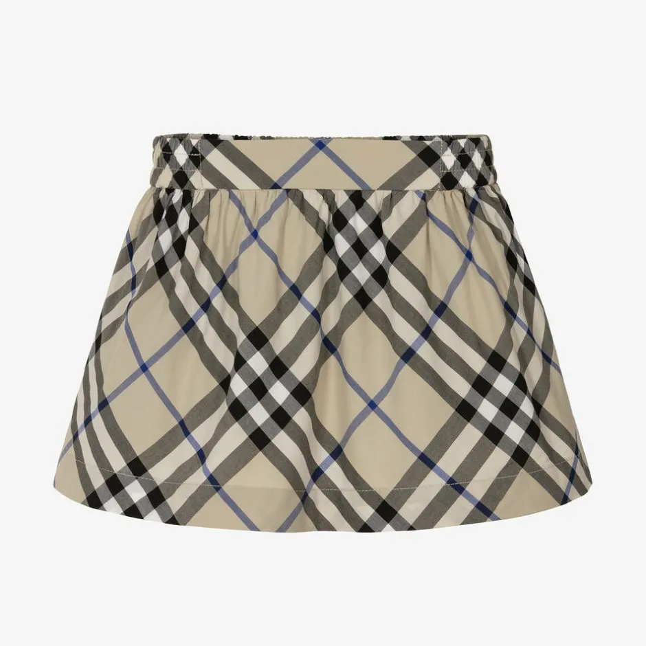 Grey skirt for baby girls by luxury British label Burberry, made in soft cotton poplin. For a distinctive designer look, this lovely skirt is patterned in the brand's signature Burberry Check with a vibrant Knight blue stripe. Lined for comfort in lightweight voile, it has useful pockets concealed in the side seams and a gently elasticated waistband for a comfortable fit. This product contains organic cotton.