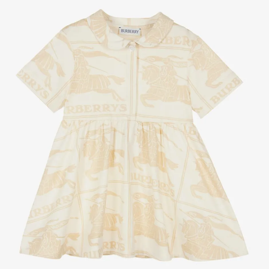 Ivory and beige dress for baby girls by luxury designer Burberry, made from soft cotton jersey. Iconic of the British brand, this short-sleeved shirt dress is designed with an Equestrian Knight Design and Burberry wordmark print in a beige colourway. It has a Peter Pan collar and a buttoned placket on the chest. This product contains organic cotton.