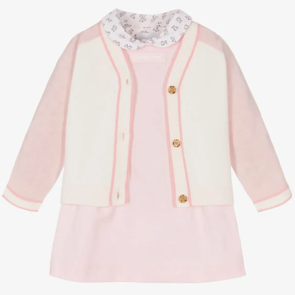 So lovely for baby girls, a wonderful pink and ivory gift set from luxury designer Burberry. Soft and lightweight, the pale pink cotton poplin blouse features a round collar, delicate cut-out details and an adorable pink and black Thomas Bear pattern. Finely knitted in soft wool, the ivory cardigan has dusky pink raglan sleeves, tortoiseshell buttons and a black and ivory bouclé Thomas Bear appliqué on the back. The pink sleeveless dress is made is stretchy, mid-weight cotton jersey, with a white box logo print and darts for a pretty silhouette. Matching pink jersey knickers complete this lovely set. Presented in a branded box, this outfit would make a beautiful gift.
