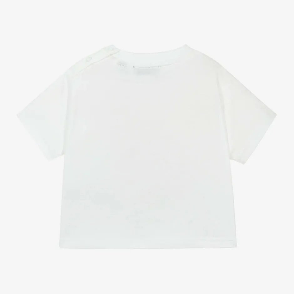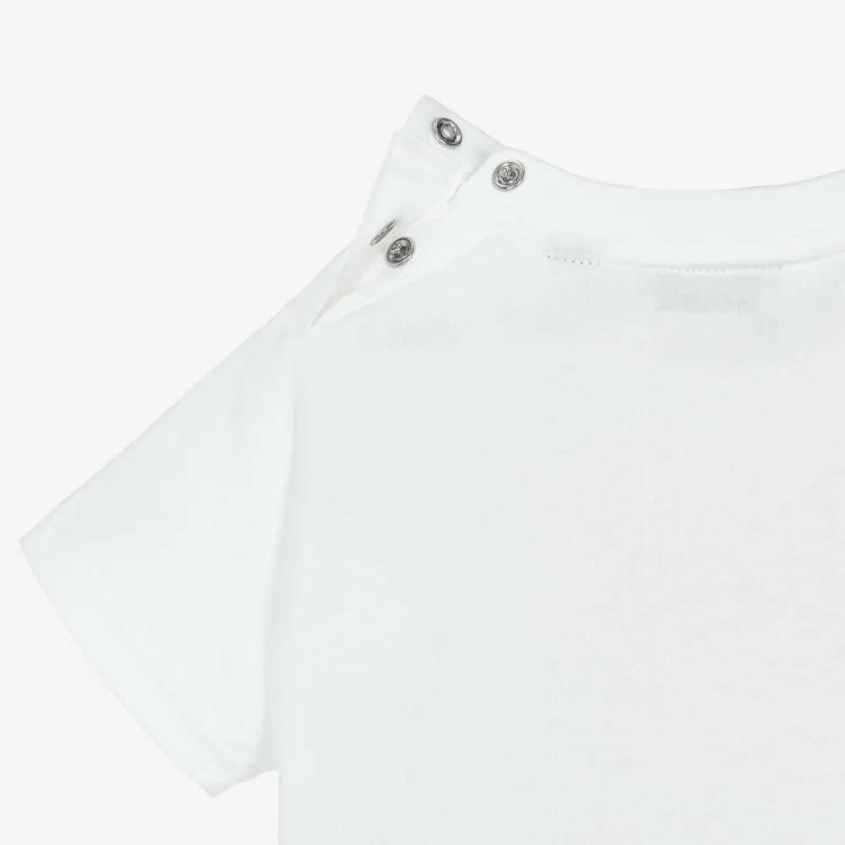 A lovely white T-shirt for baby girls by luxury British brand Burberry, made from soft cotton jersey. Printed on the front is a vibrant pink and green crayon-style rose illustration with branded detailing for a signature finish. Great for a pretty yet casual look, it has seamless short sleeves and practical popper fastenings on one shoulder. This product contains organic cotton.