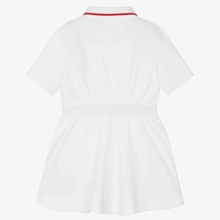 Inspired by the adult collection, this white polo dress for baby girls is by luxury British brand Burberry. Making an instant statement, it has a red and white varsity-inspired logo on the chest pocket, with matching colour trim on the ribbed collar. Made in soft piqué, the dress has front button fastenings and a comfortable elasticated waist. This item contains organic cotton.