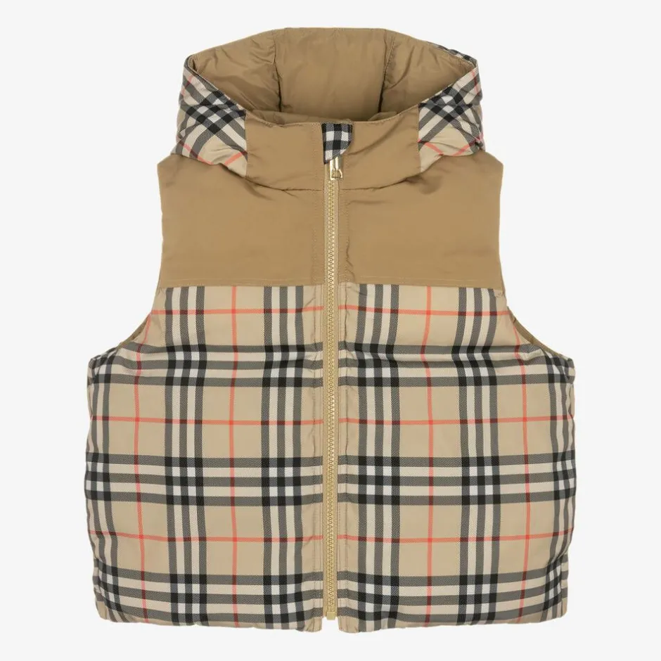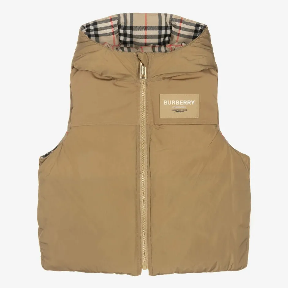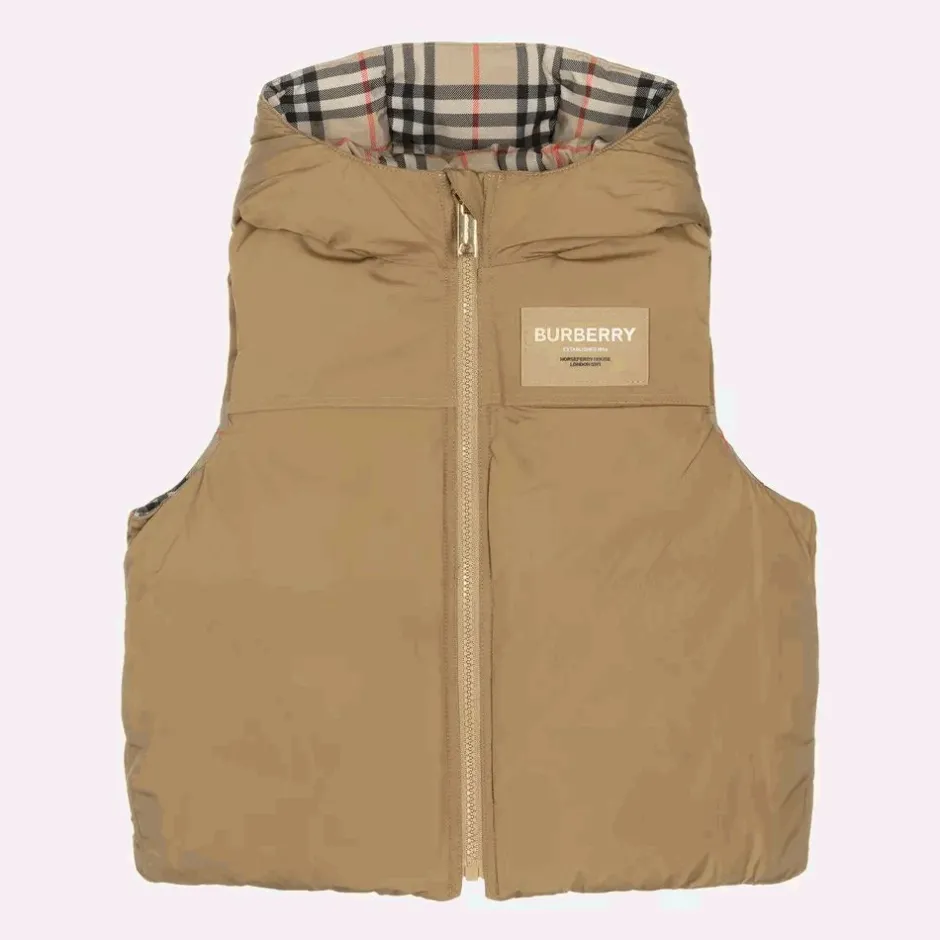 Archive beige reversible puffer gilet for boys from British designer Burberry. Made in silky and smooth fabric, it is padded with luxurious down for supreme warmth. One side is plain beige, with the British label's Horseferry logo patch and the iconic Vintage check pattern on the hood lining. The reverse is designed with beige canvas and silky Vintage check panels in the signature beige, red and black colour palette. Both sides have popper-fastening pockets and a gold statement branded zip fastening.