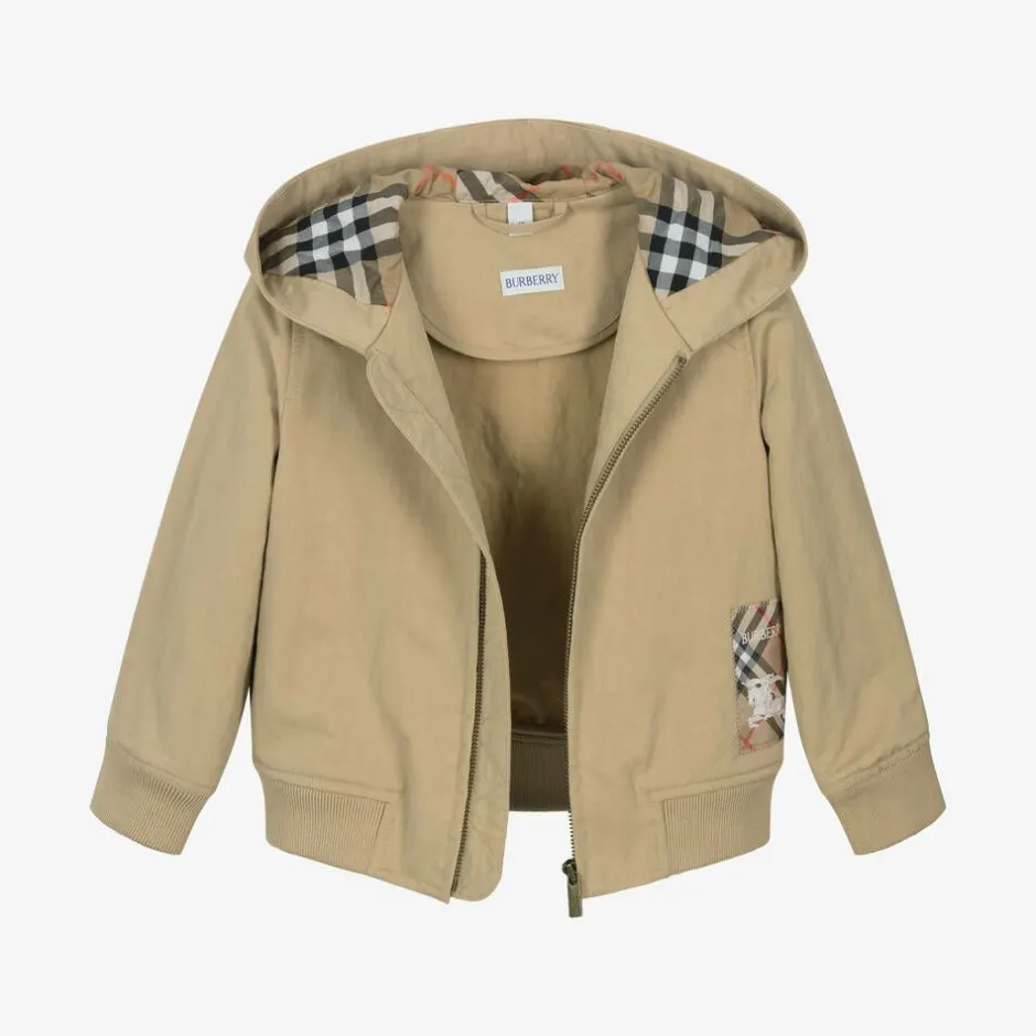 Beige zip-up jacket for boys by luxury brand Burberry, made in cotton-blend twill. The fixed hood is lined in the designer's signature Burberry Check and the front has a Burberry Check patch embroidered with the designer's iconic Equestrian Knight Design. There are cosy ribbed trims and popper-fastening side seam pockets.