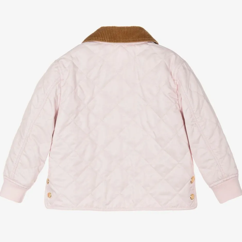 Girls pink quilted jacket by British brand Burberry, beautifully lined with the brand's iconic Vintage check. Trimmed with a beige corduroy collar and soft ribbed cuffs, this classically styled jacket has large patch pockets on the front. There are stylish gold popper fastenings on the side vents and a branded gold zip on the front, for an added designer touch.