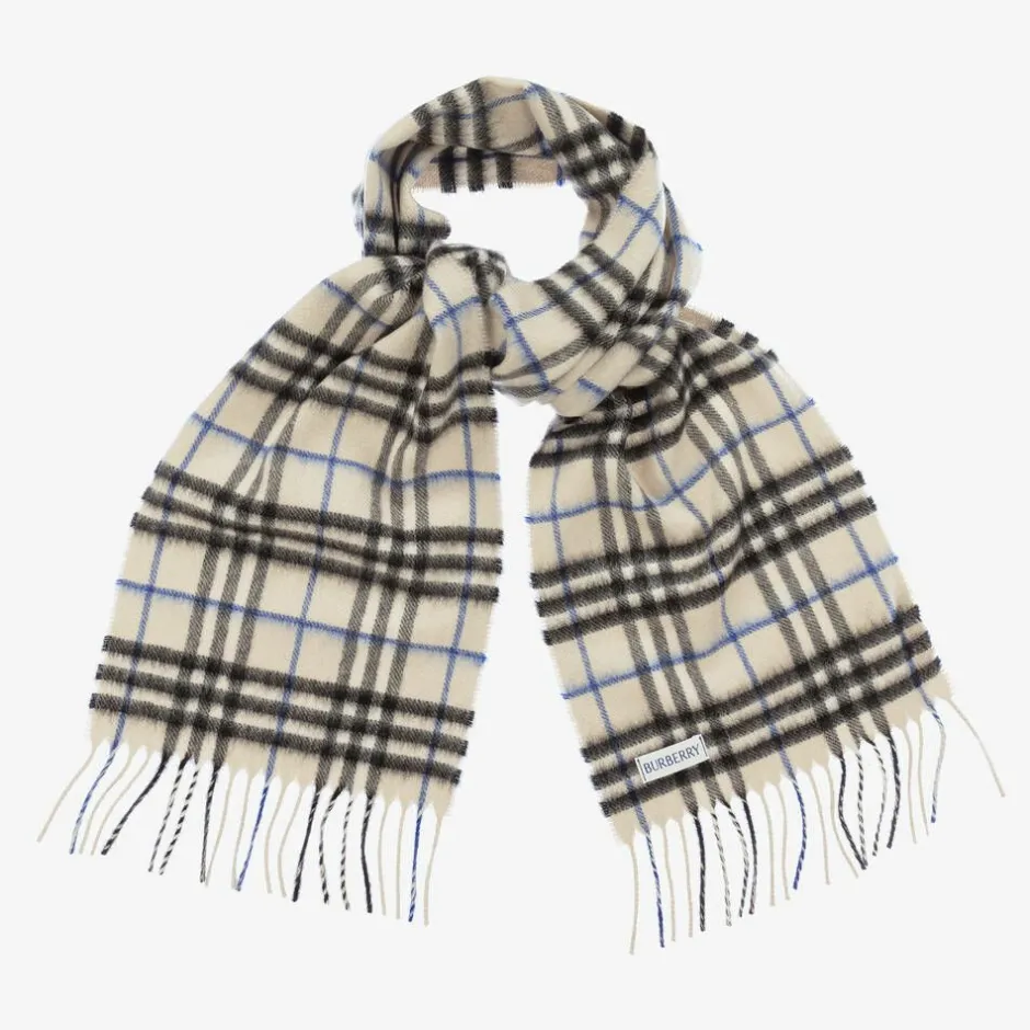 Designed by luxury brand Burberry, this light grey-beige cashmere scarf for boys and girls is ideal for adding a designer accessory to colder days. Woven at a 200 year old Scottish mill using traditional looms, this beautifully soft scarf is made in their iconic Burberry Check with Knight blue stripes for a modern yet heritage look.