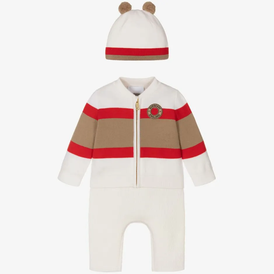 A lovely three-piece trouser set for baby boys and girls by Burberry. Knitted in luxurious Merino wool, the outfit includes ribbed trousers, a zip-up sweater with a silicone stamp logo and a matching hat with pom-poms. Warm and cosy, the items are in ivory, with red and beige colourways. Responsibly sourced wool.