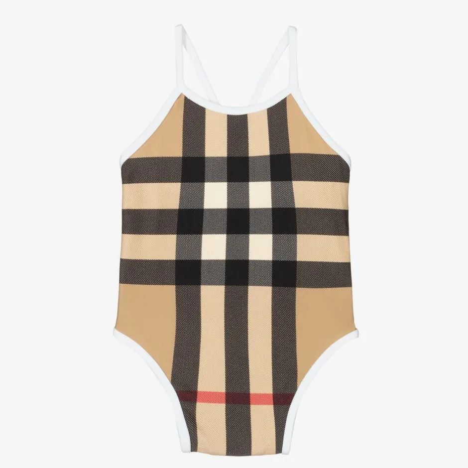 Baby girls Archive beige oversized check swimsuit from luxury designer Burberry. Fully lined, it is made in soft and stretchy recycled nylon. There are white crossover straps for a secure fit.