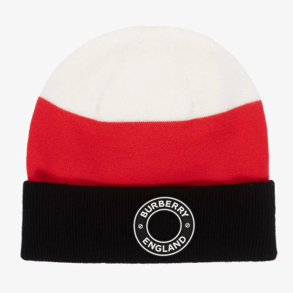 Red, ivory and black striped hat by Burberry. Knitted in luxurious Merino wool, this fine ribbed hat will be warm and comforting against the elements. It has a snug fit and a turn-up brim, with a silicone off-centre logo badge at the front. Suitable for girls and boys.