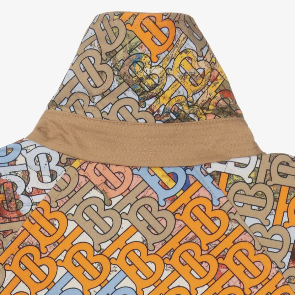 Luxury trench coat for teen boys and girls by British brand, Burberry. It is made in soft cotton gabardine fabric, enhanced by eye-catching Monogram prints in shades of beige, orange and blue, with map accents. Traditional features include double-breasted button fastenings, gun flap, belted cuffs and a storm shield. It is lined in silky cupro with a Burberry logo jacquard weave. Useful side pockets and a belt complete this contemporary twist on a classic design.