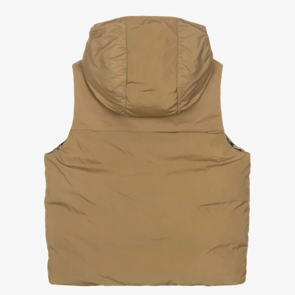 Archive beige puffer gilet for teen boys from British designer Burberry. Reversible to switch up his look, both sides are made in silky-smooth fabric, and padded with luxurious down for supreme warmth. One side is plain beige, with the British label's Horseferry logo patch on the front and the iconic Vintage check pattern on the hood lining. The reverse is designed with beige canvas and silky Vintage check panels for a cool multi-textural finish. Both sides have popper-fastening pockets and a gold branded zip closure.
