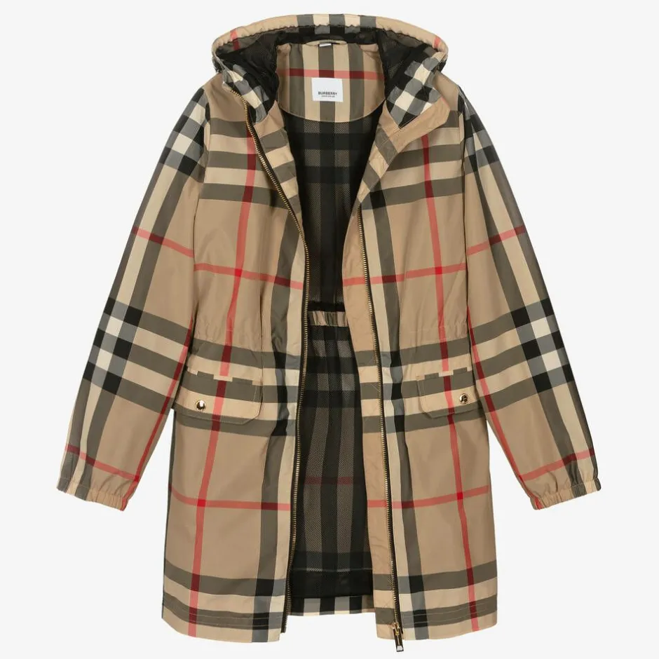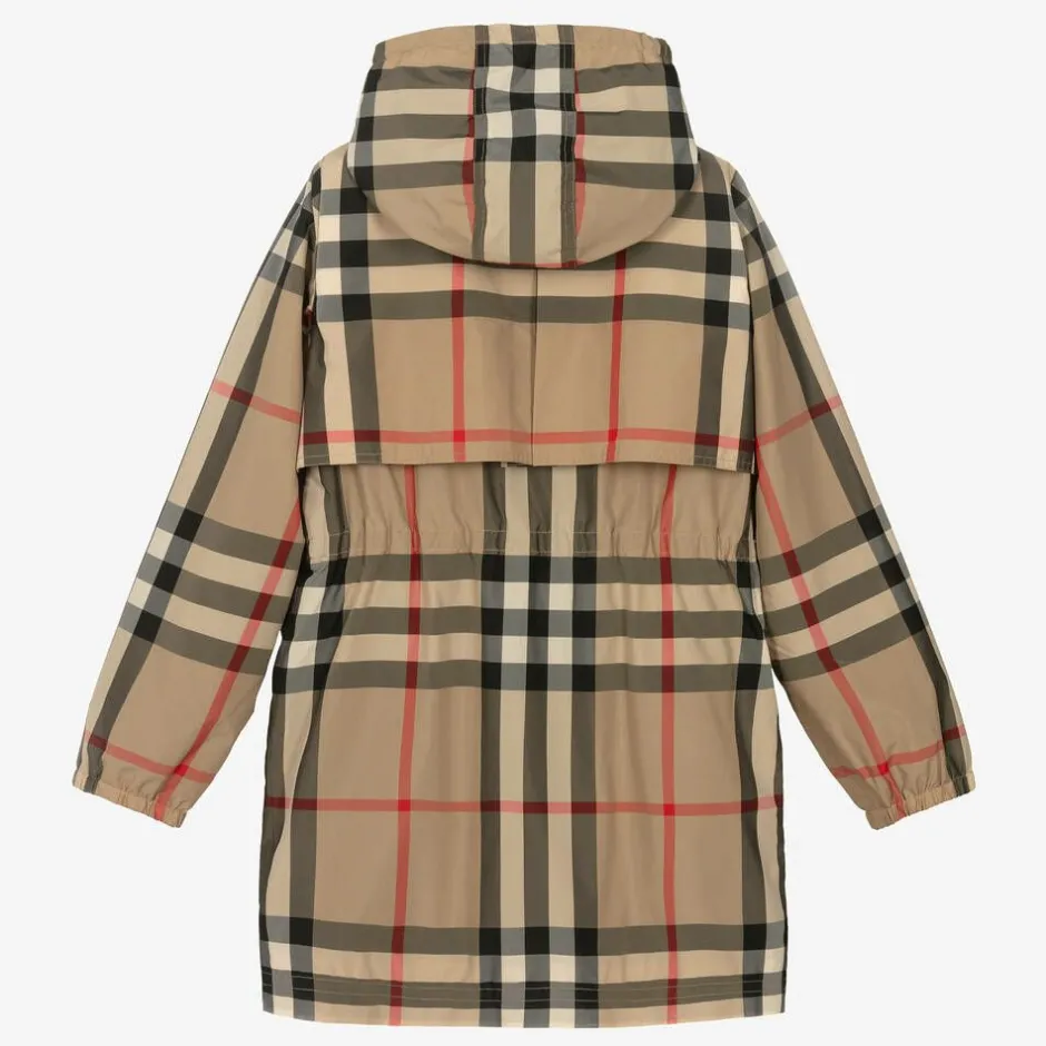 A longer length coat for teen girls by luxury British brand Burberry, patterned in the iconic oversized check. In Archive beige, this practical layering piece is made from silky smooth fabric with a protective hood, an elasticated waist, and a traditional rain shield on the back. It has useful popper-fastening pockets on the front and is fully lined with black mesh for a sporty touch. The gold zip fastening is engraved for an extra designer detail.