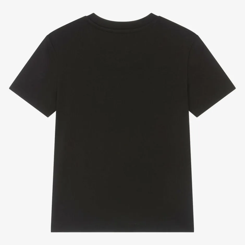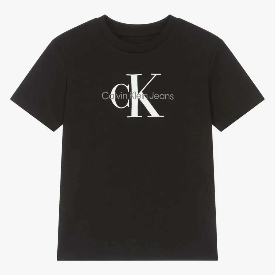 Black short-sleeved T-shirt for little boys and girls by Calvin Klein, made from soft cotton jersey. Great for a casual and laid-back look, it is printed with a white and grey Calvin Klein monogram for an iconic finish.
