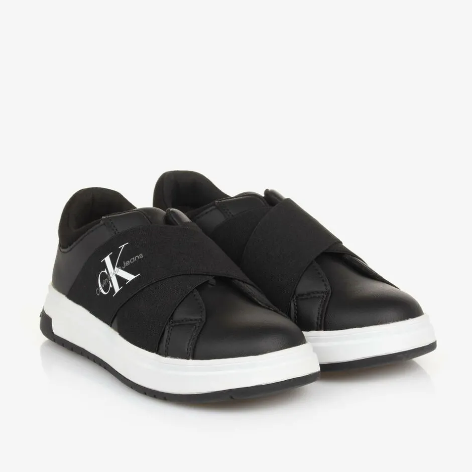 From Calvin Klein, black faux leather trainers for boys and girls. Styled with a smart finish, these comfortable trainers have elastic crossed over the foot for a secure fit. This product was made from at least 50% recycled polyester.