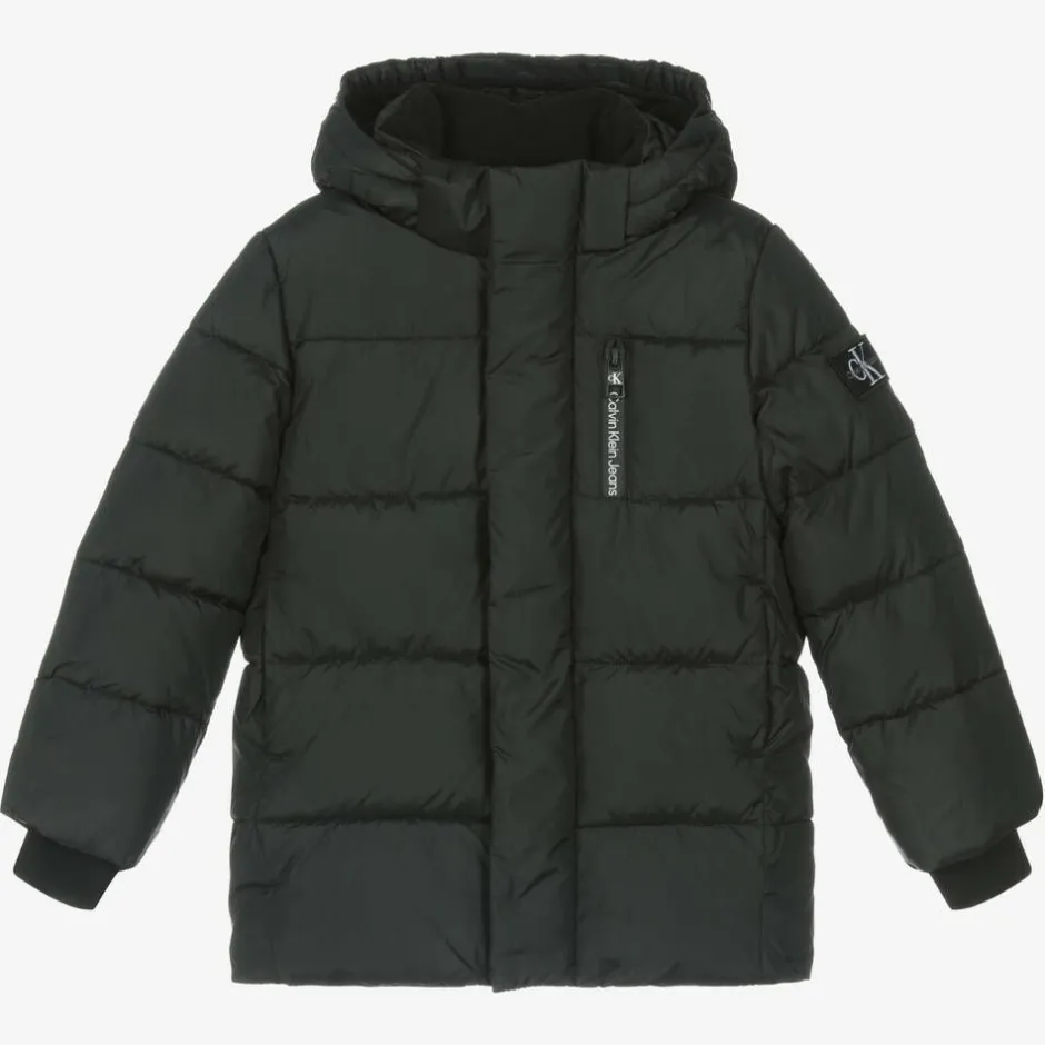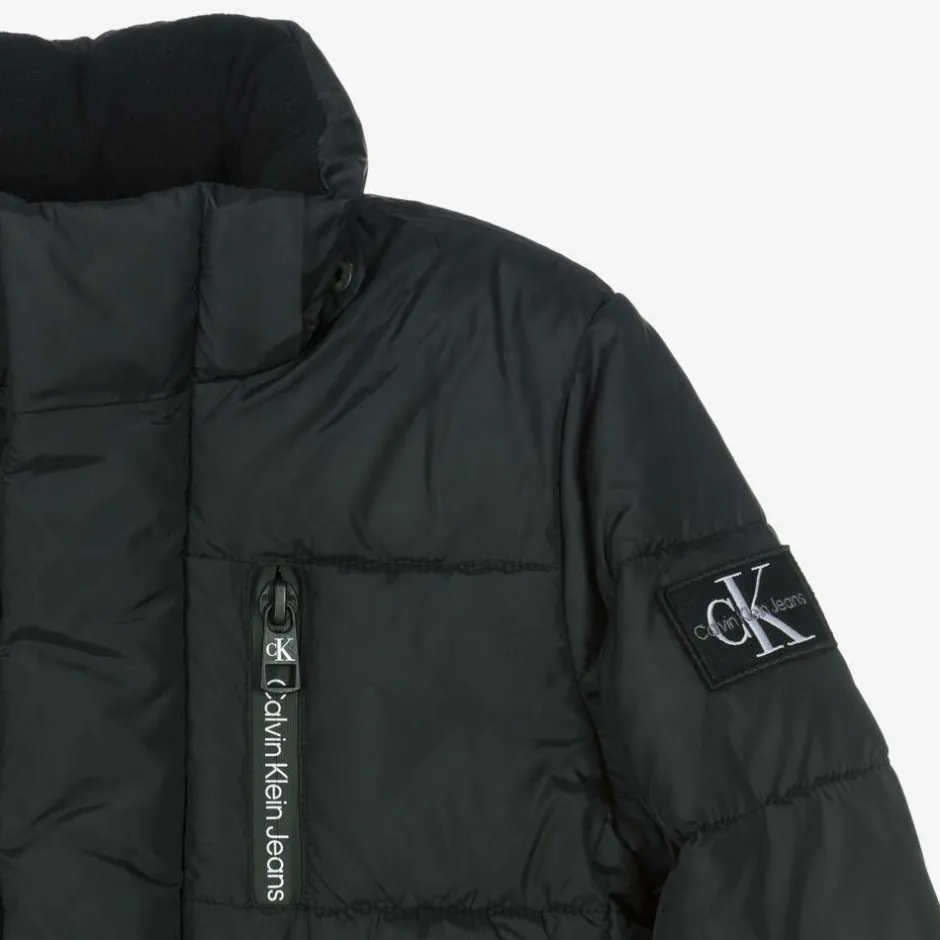 Black puffer jacket for boys by American brand Calvin Klein, with a removable hood. Made in silky smooth fabric and warmly padded, it fastens with a zip beneath a velcro-fastening flap. For added protection from the elements, the sleeves have ribbed cuffs and the popper-fastening pockets are fleece lined. There is a useful branded, zip-fastening chest pocket and a further logo patch on one sleeve gives a distinctive designer touch. The fabric and lining are made from 100% recycled polyester and the insulation is made with 90% REPREVE recycled polyester.