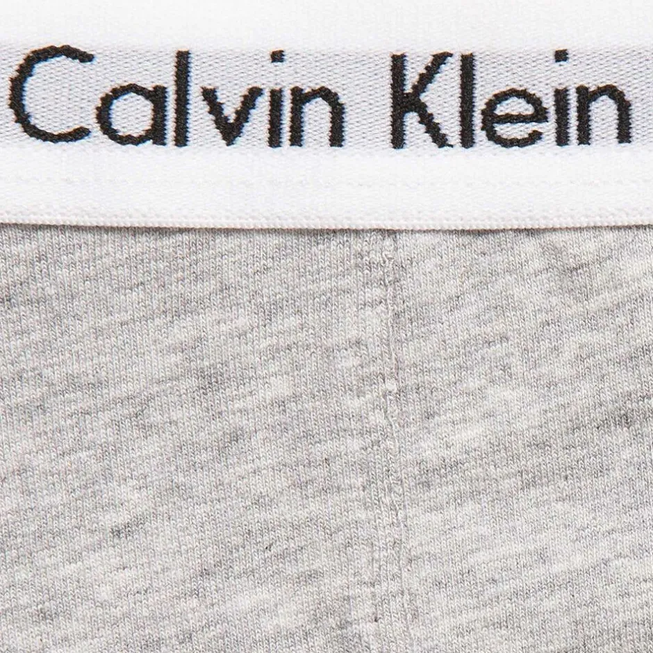 Calvin Klein, pack of briefs for boys. Made with soft, stretchy cotton jersey and both have an elasticated waistband featuring the designer's name. One pair is in white and the other other pair is in pale grey.