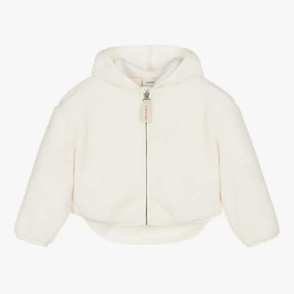 Ivory zip-up top for girls by Calvin Klein, made in cosy sherpa fleece for warm layering. Ideal for the changing seasons, this hooded top has a branded grosgrain zip pull and side seam pockets. It has gently elasticated trims and a curved hem that falls slightly longer at the back. It is made with at least 95% recycled fabric.