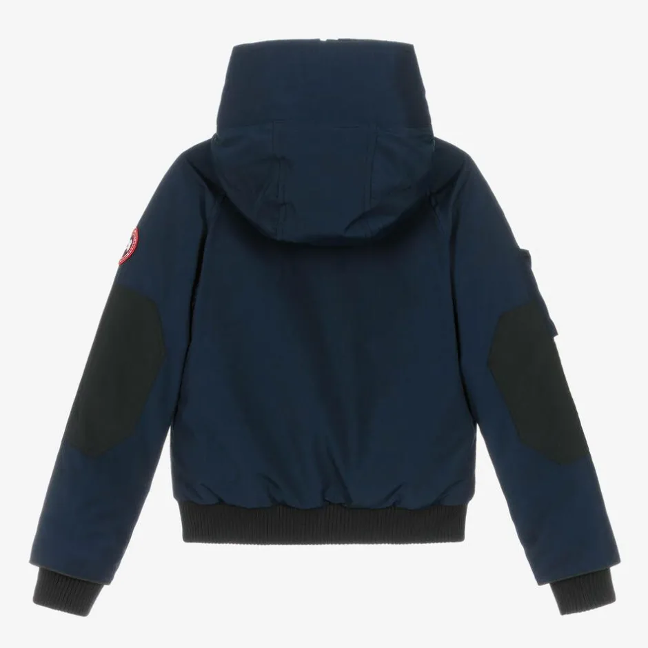 A navy blue technical bomber jacket for boys and girls from luxury outerwear designer Canada Goose, with the famous logo patch on the sleeve and label on the pocket. Made from the label's recycled organic ARCTIC TECH canvas, the jacket boasts arctic storm-proof qualities to keep them warm and dry in harsh weather conditions. Padded with down, this cosy jacket fastens with a two-way zip and has a concealing popper placket for added protection. The front pockets are fleece-lined, ideal for warming hands. There are reinforced CORDURA panels on the elbows for durability and a zip-up sleeve pocket, ideal for storing a ski pass.