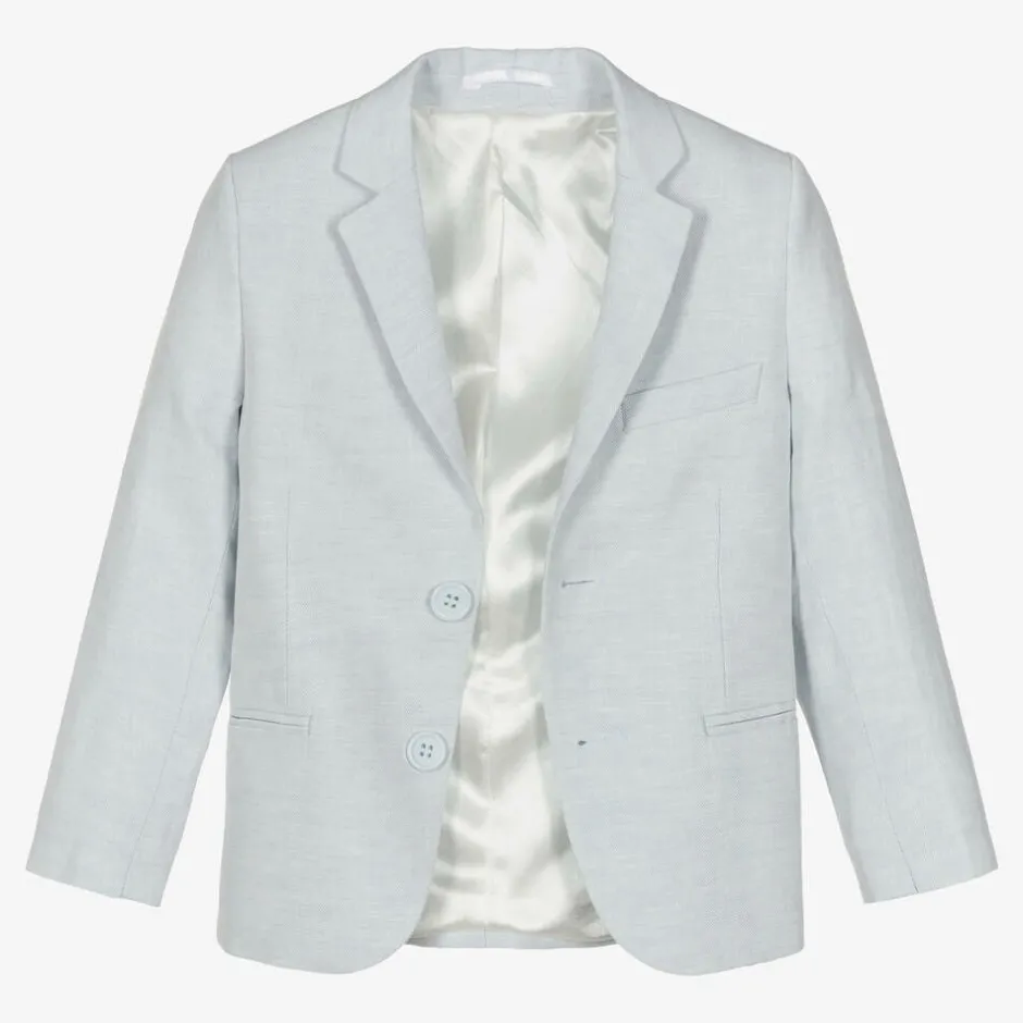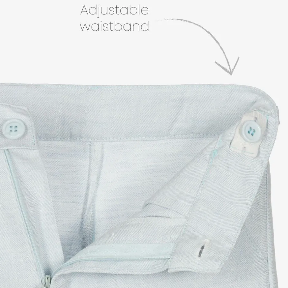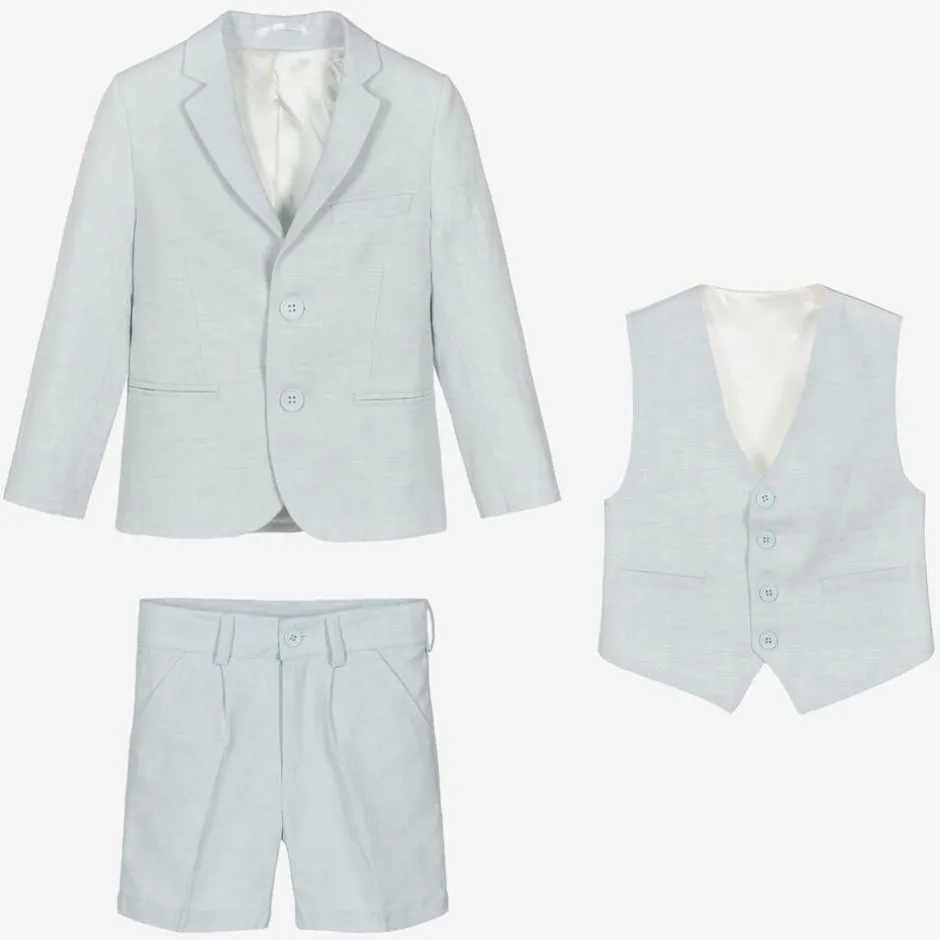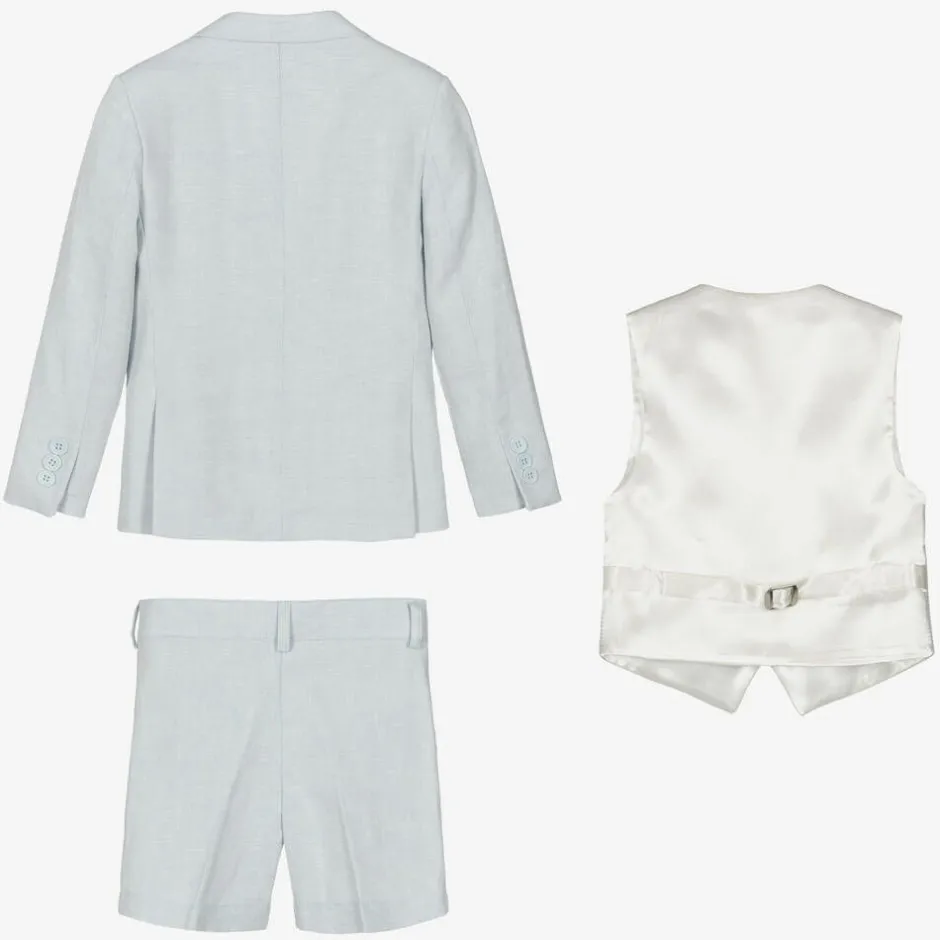 Smart and stylish, this pale blue three-piece suit for boys is by Caramelo Kids. The long-sleeved blazer has a notched collar, front button fastenings, welt pockets, and a useful internal pocket for a discreet finish. The sleeveless button-up waistcoat has faux pocket detailing and a rear cinch clasp on the reverse for a slimmer fit. Closing with a button and zip, the coordinating shorts have slanted pockets and belt loops on the adjustable waist. Effortlessly chic, each piece is made from smooth cotton twill with a silky ivory lining for added comfort.