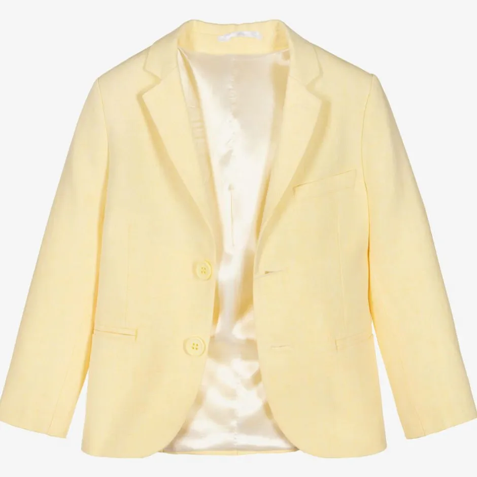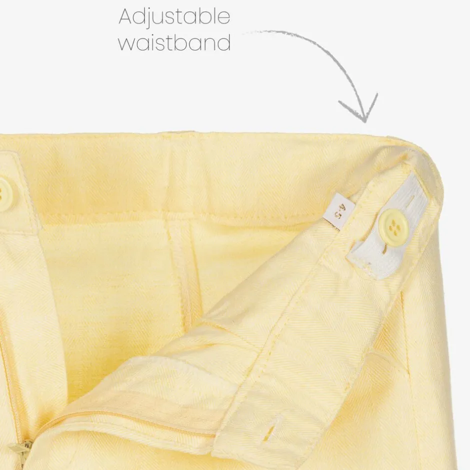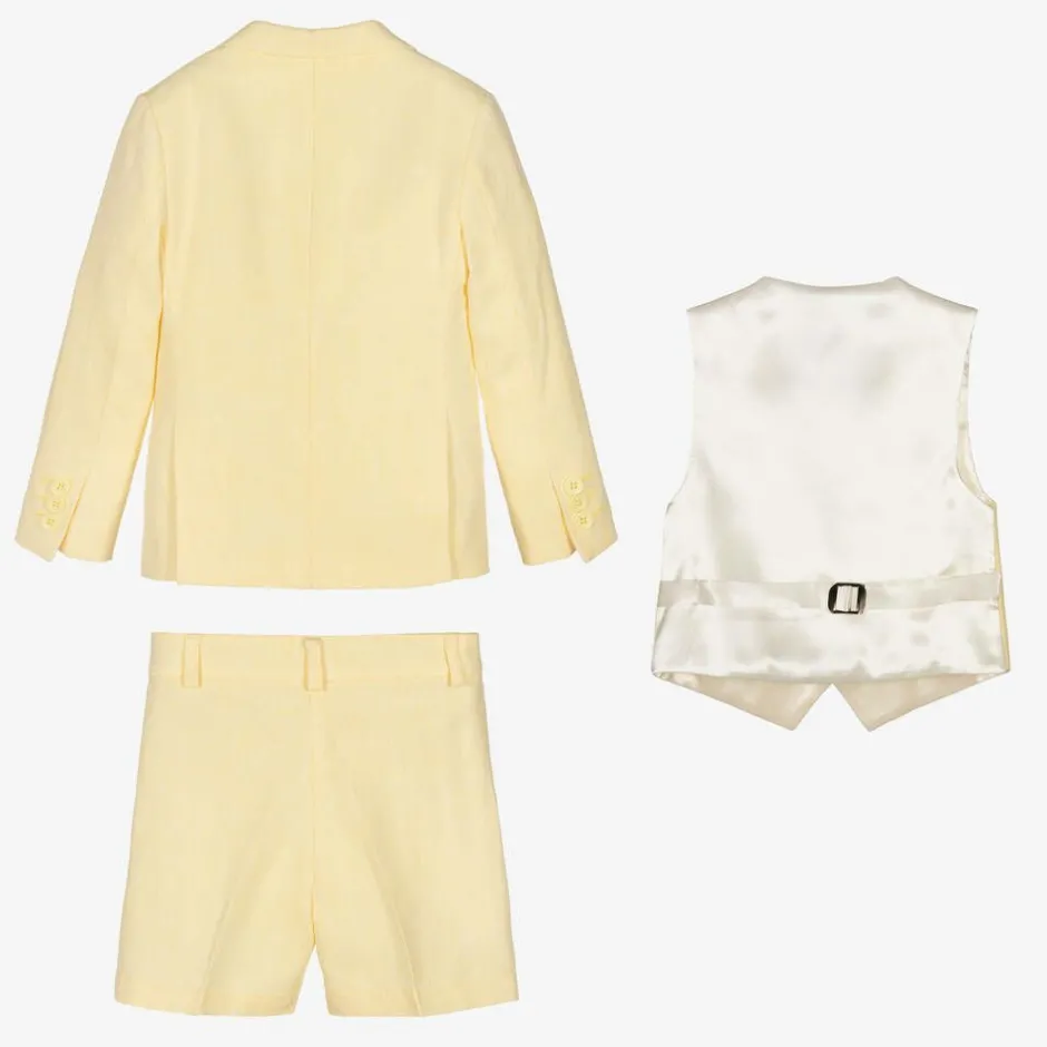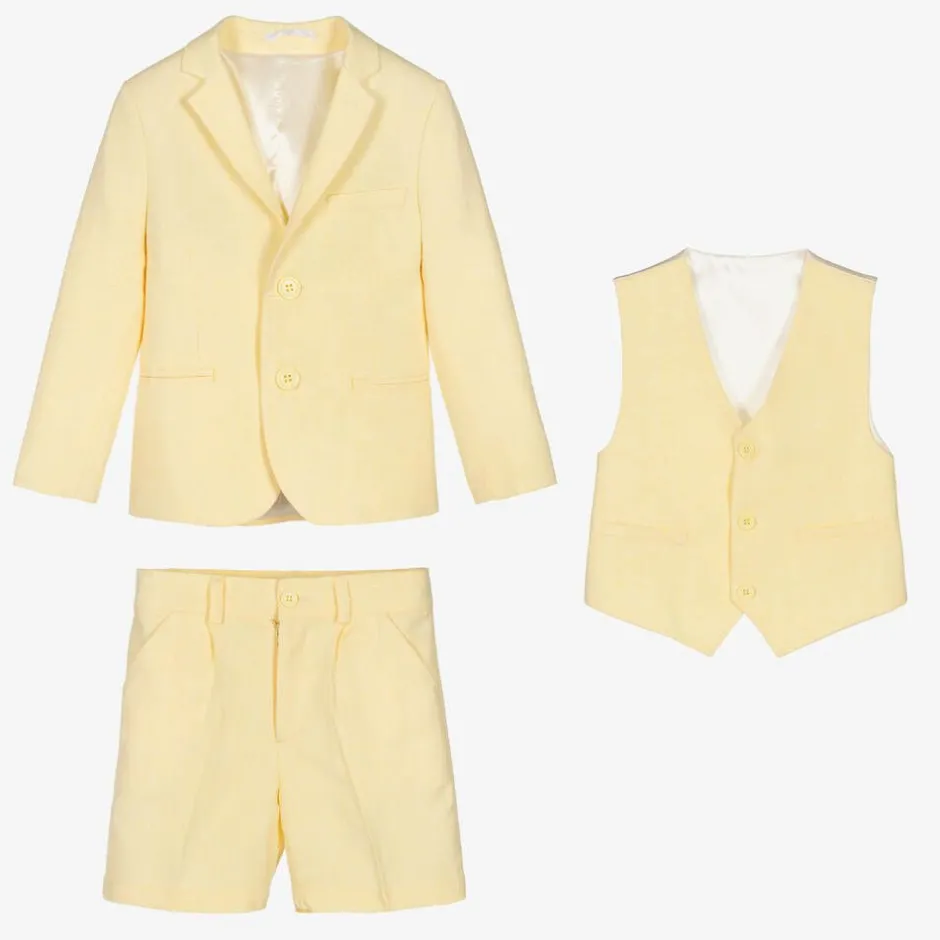 Charming three-piece pale yellow shorts suit for boys by Caramelo Kids, made in a linen and cotton blend in a subtle herringbone weave. This warm-weather smart set includes a tailored blazer, coordinating shorts and a matching waistcoat. The jacket fastens with buttons and is lined in silky satin. The shorts have a button and zip to fasten, with belt loops and an adjustable waistband. The waistcoat has a white silky satin backing with an adjustable buckle strap and buttons on the front to fasten.