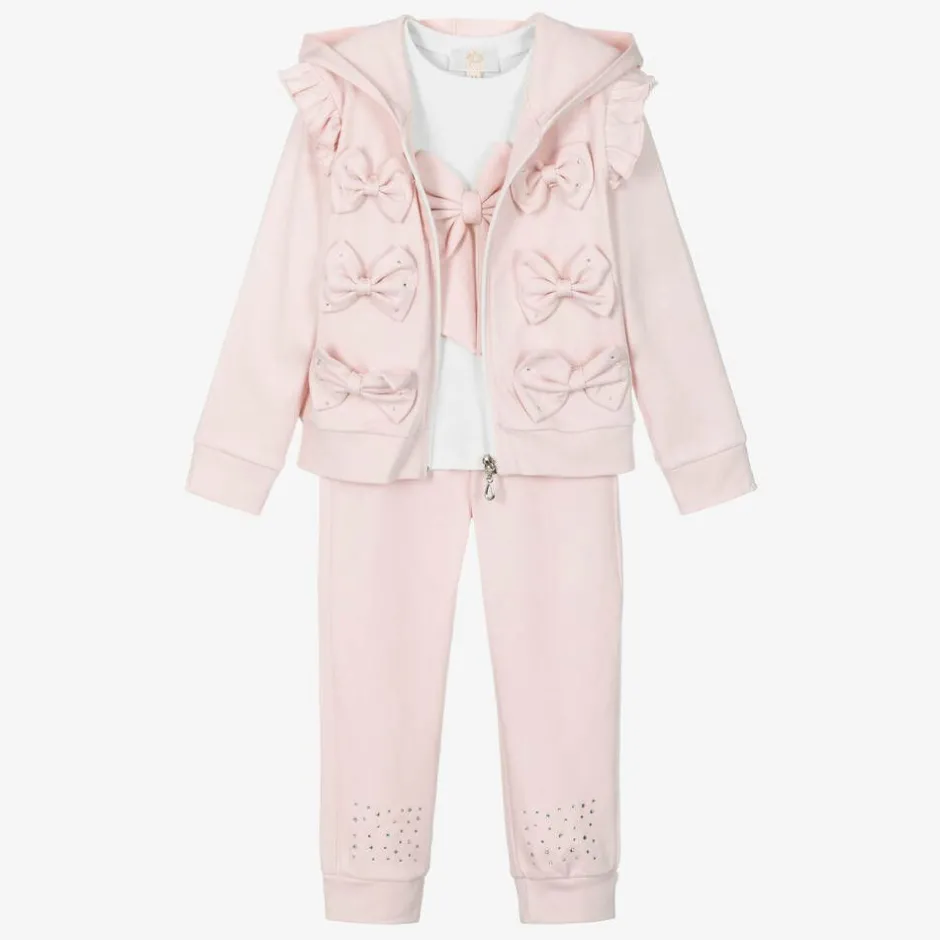 Stunningly casual, a pale pink cotton jersey tracksuit set for girls, by Caramelo Kids. The zip-up hoodie is decorated with ruffles and bows, whilst the matching trousers have diamanté detailing for added sparkle. This tracksuit pairs comfortably with a white long-sleeved T-shirt, which is finished with a pretty bow.
