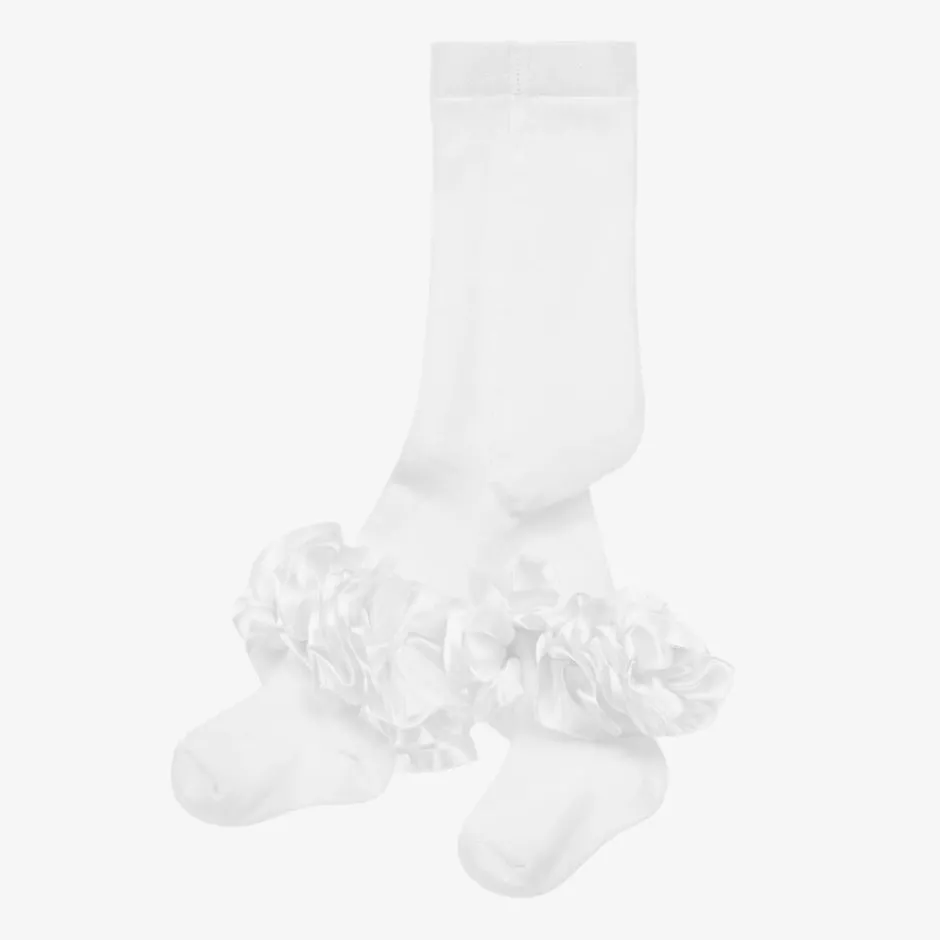 Lovely white tights for girls by Caramelo Kids, made in a soft and stretchy cotton blend. Comfortable to wear, this pretty style has a large satin ruffle around each ankle.