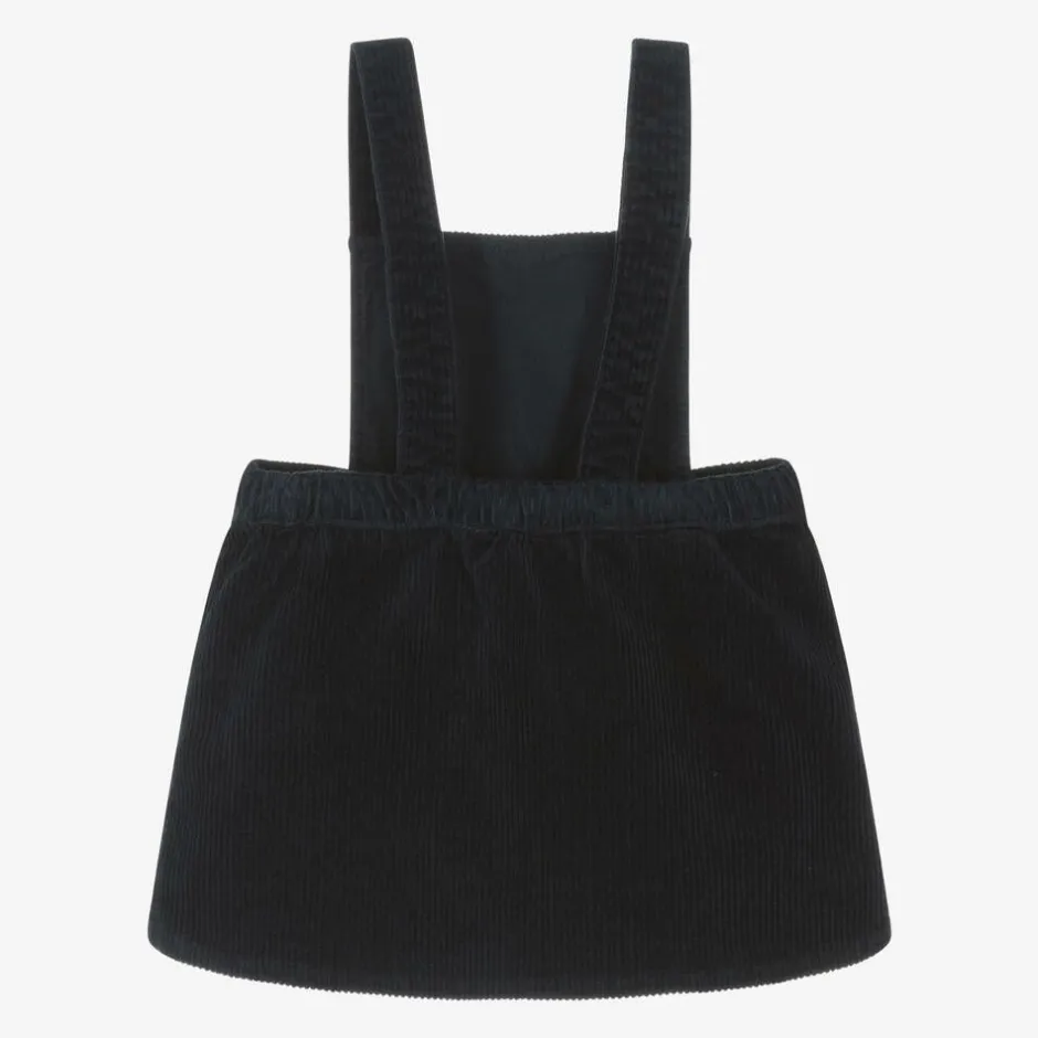 A cute navy blue pinafore dress for little girls by Carrément Beau, made in beautifully soft cotton corduroy. The bib front has sweet embroidered hearts on each side and adjustable shoulder straps for a good fit. Gently elasticated at the waist, the full skirt has sweet front pockets.