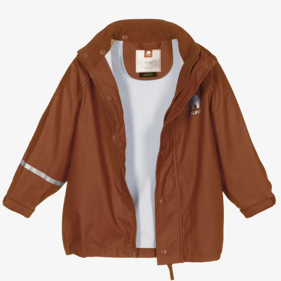 Waterproof brown two-piece rainsuit for boys and girls by CeLaVi. It is made from smooth, coated fabric and has reflective logo trims. Fastening with a zip underneath a popper storm flap, the jacket has a detachable hood, a cosy-fleece lined collar and adjustable velcro on the cuffs. The trousers have an elasticated waist and adjustable elasticated stirrups, to hold them securely. The smaller sizes have salopette style trousers with poppers at the side and adjustable elasticated shoulder straps. This rainwear is fully windproof and has welded seams to keep your child warm and dry.
