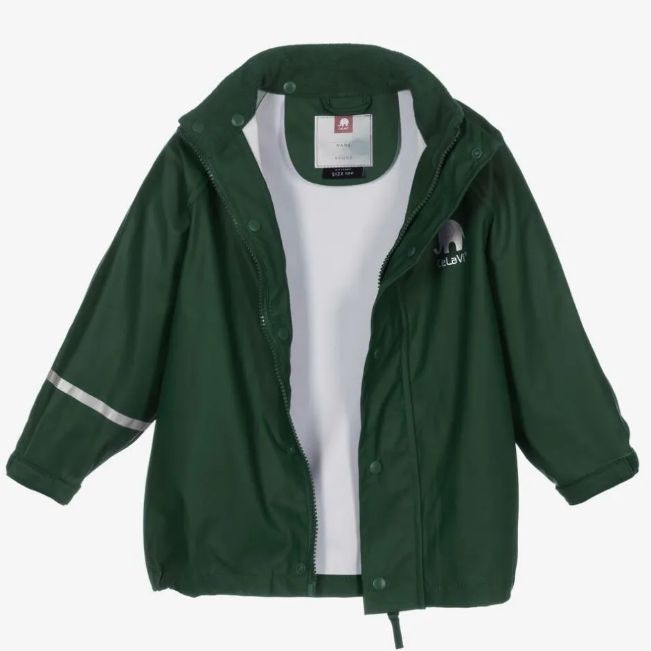 Waterproof dark green two-piece rainsuit for boys and girls by CeLaVi. It is made from smooth, coated fabric and has reflective logo trims. Fastening with a zip underneath a popper storm flap, the jacket has a detachable hood, a cosy-fleece lined collar and adjustable velcro on the cuffs. The trousers have an elasticated waist and adjustable elasticated stirrups, to hold them securely. The smaller sizes have salopette style trousers with poppers at the side and adjustable elasticated shoulder straps. This rainwear is fully windproof and has welded seams to keep your child warm and dry.