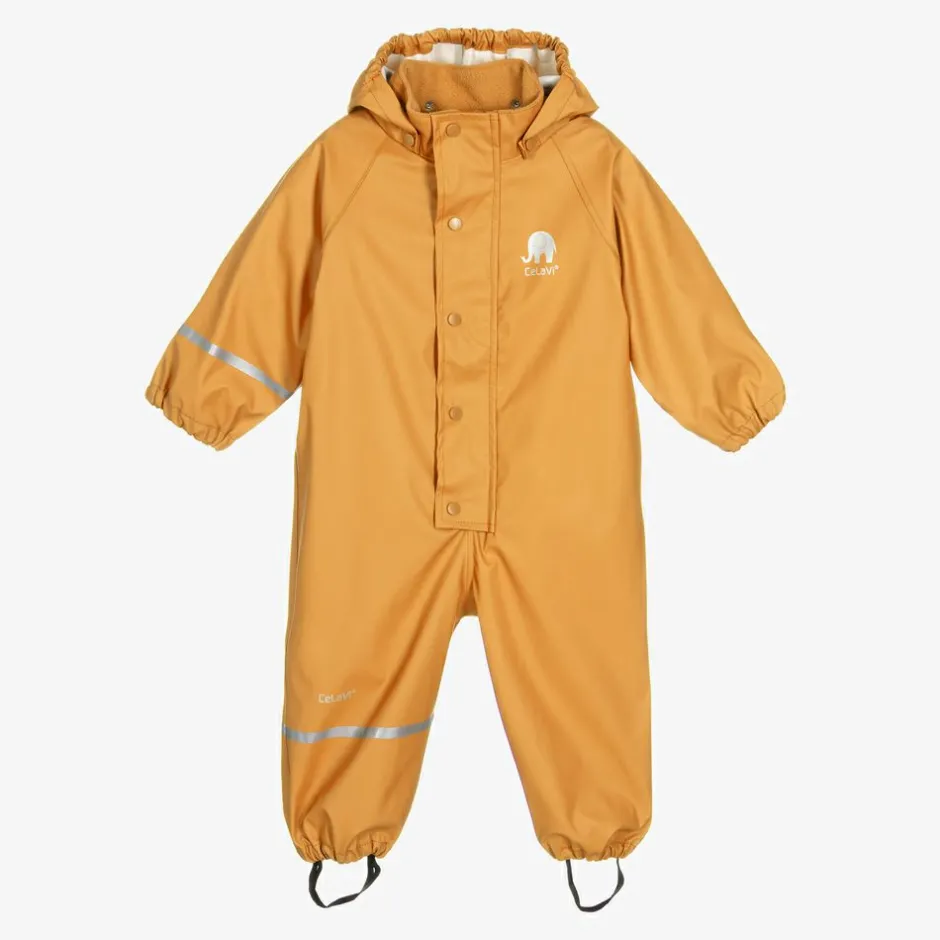 A yellow waterproof rainsuit for boys and girls by CeLaVi, made in smooth coated fabric. With reflective logo trims for added safety, this windproof rainsuit has a useful detachable hood, a cosy fleece-lined collar, and a storm flap over the front zip. A practical design, it has adjustable elasticated stirrups and welded seams to keep your little one dry when splashing in puddles.