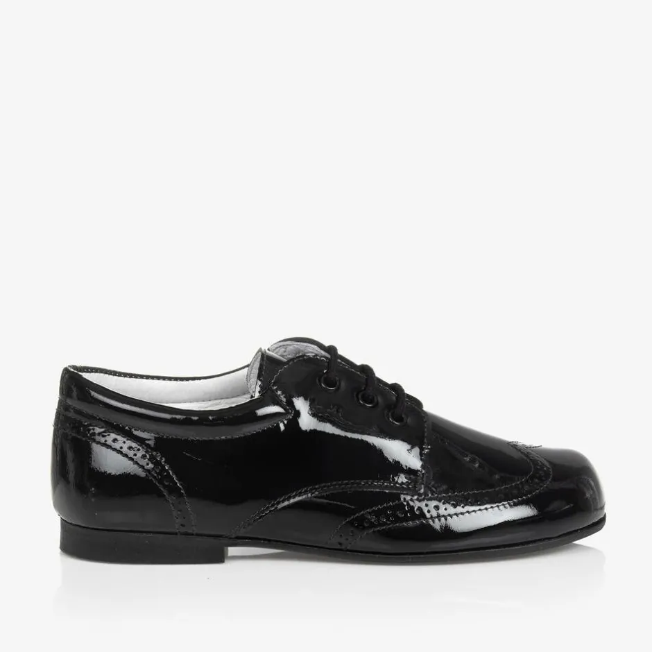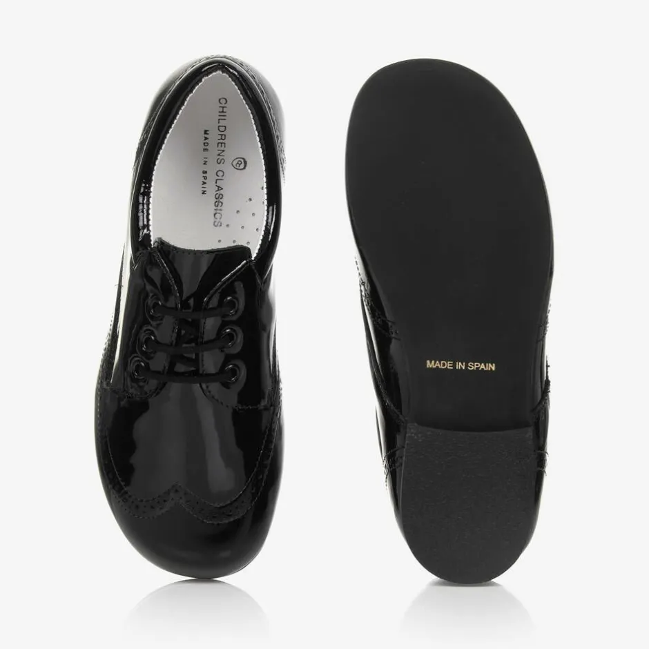 Exclusive to Childrensalon, a pair of smart black patent leather lace-up shoes for boys by Children's Classics. Soft and comfortable, these traditional style brogues have a leather lining, padded insole and a rubber outsole.