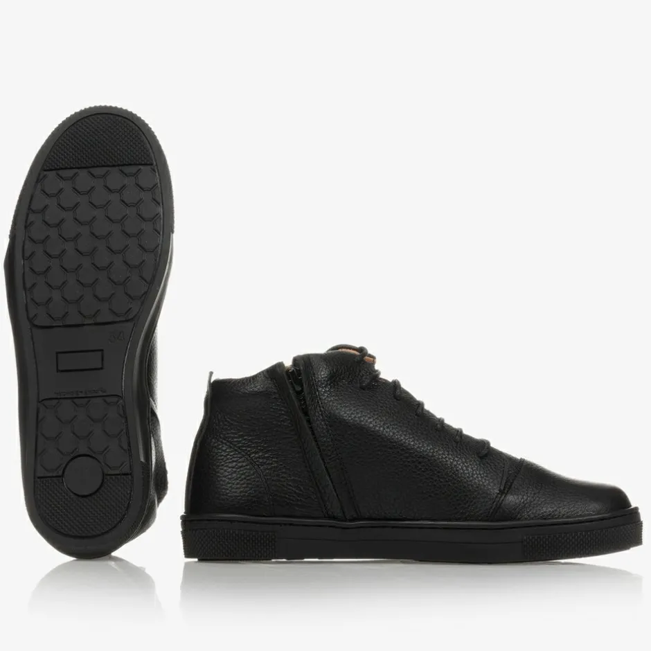 Exclusive to Childrensalon, a pair of black ankle boots for boys by Children's Classics, made in soft textured leather. These lace-up boots have a side zip fastening with a soft leather lining and non-slip rubber soles.